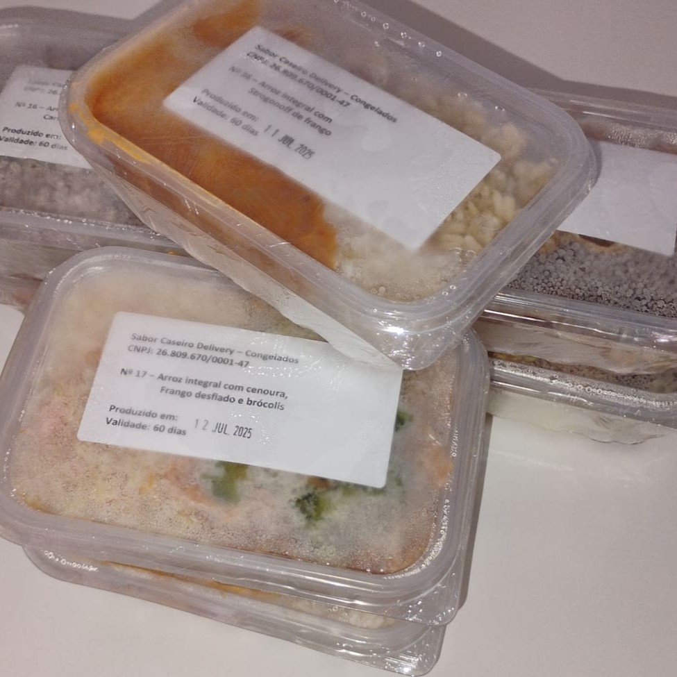 Kit com 7 marmitas de arroz integral c/ e s/ cenoura variando com os seguintes acompanhamentos: panqueca de carne, carne moída com brócolis, carne de panela com cenoura, frango desfiado com brócolis, bife rolê, strogonoff de frango e frango xadrez - Marmitas nº 13/16/17/18/19/25/36 - Peso total: 2800g - Produto congelado - Entrega em até 48 horas