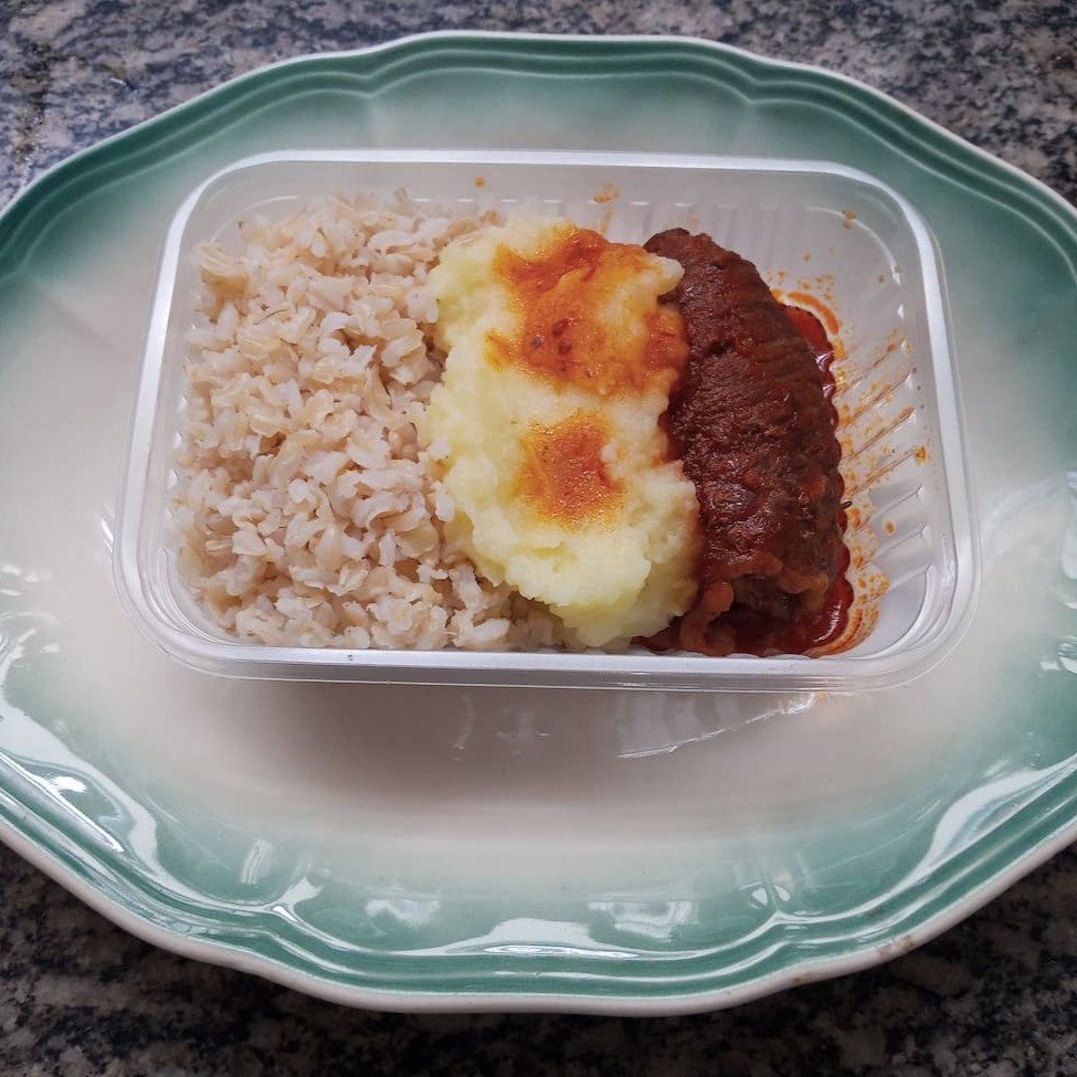 Arroz integral com bife rolê (Azeitona, bacon, cenoura) e purê de batata inglesa, embalagem própria para freezer e microondas - Peso 300g - Produto congelado - Entrega em 48 horas
