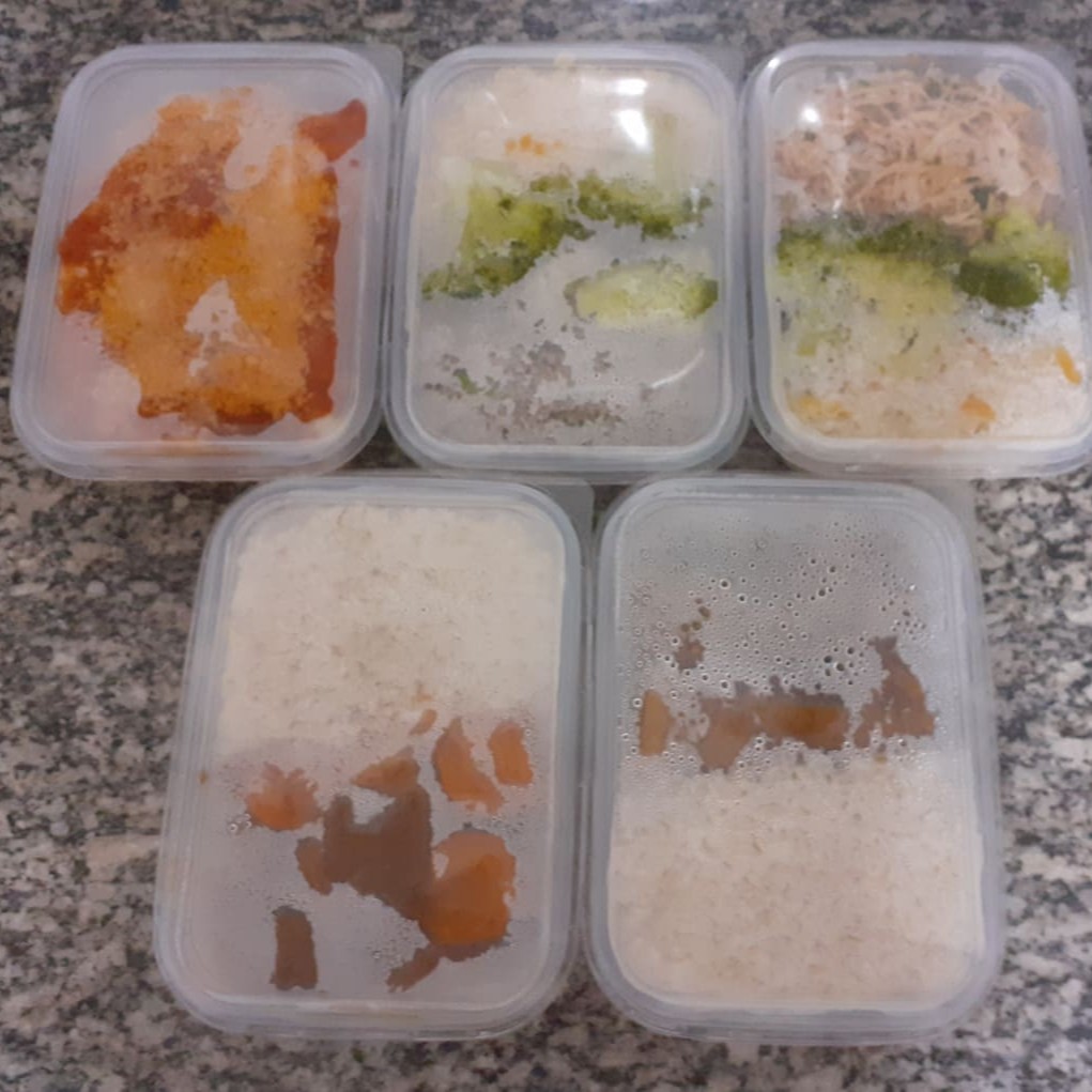 Kit com 5 marmitas com as seguintes variações : Frango desfiado com purê de batata doce e brócolis/ arroz integral com panqueca de frango/ carne moída com purê de batata doce e brócolis/ Arroz integral com cenoura, frango desfiado e brócolis/ Arroz integral com carne de panela e cenoura - Marmitas nºs 12/14/15/17/18 Peso Total: 2000g - Produto congelado - Entrega em até 48 horas