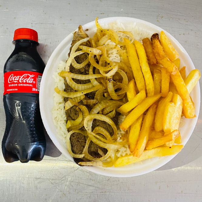 Combo Bife Acebolado, Arroz, Fritas + Coca Cola Grátis.