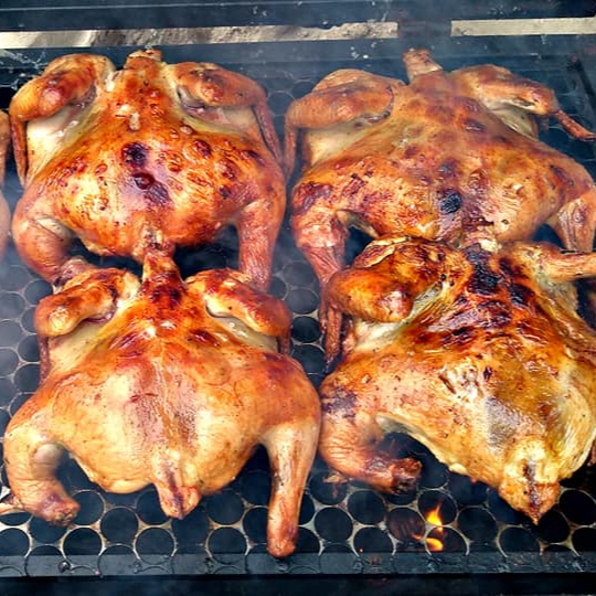 Frango com gostinho de churrasco, esse e sunoscesso, so frango é assado lentamente na brasa, fica uma delicia e com gostinho de churrasco defumado, acompanha farofa crocante gourmet com chimichurri.