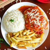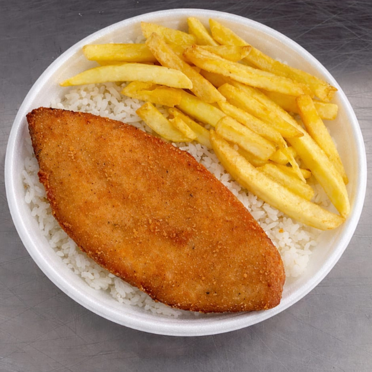 Delicioso Parmegiana de Frango acompanhado de arroz fresquinho + Batata Frita.