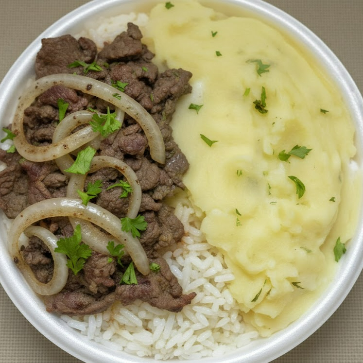 Marmita com delicioso bife acebolado grelhado acompanhado de arroz branco, feijão e purê de batata inglesa. Marmita indicada para 01 pessoa.