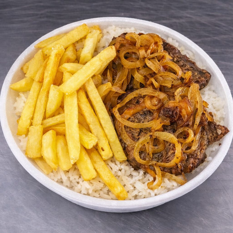 Marmita com delicioso bife acebolado grelhado acompanhado de arroz branco, feijão e fritas. Marmita indicada para 01 pessoa.