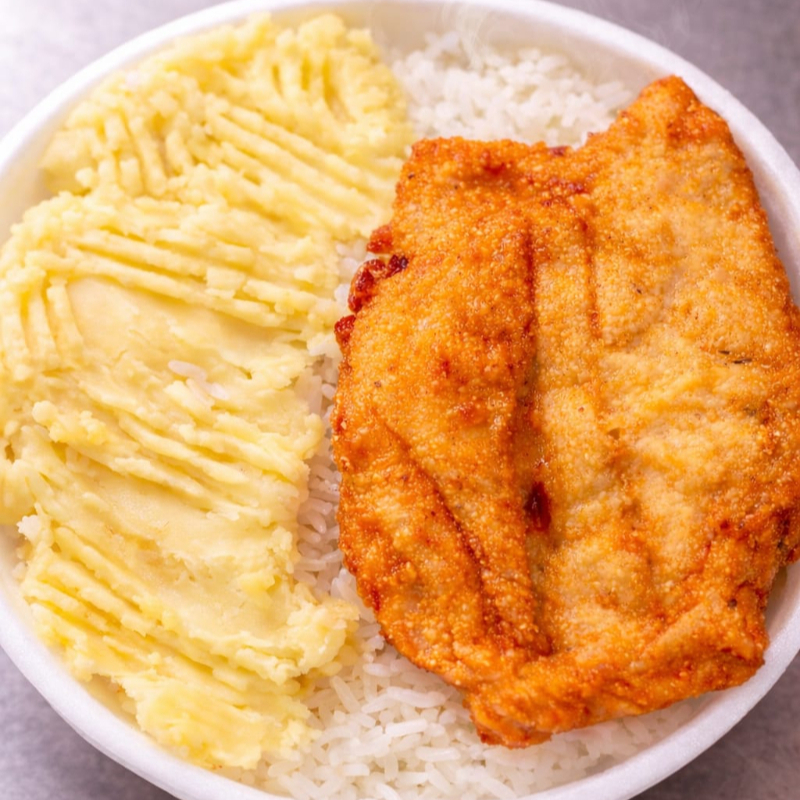Marmita com delicioso filé de frango empanado na massa crocante acompanhado de arroz branco, feijão e purê de batatas inglesas. Marmita indicada para 01 pessoa. Marmitex
