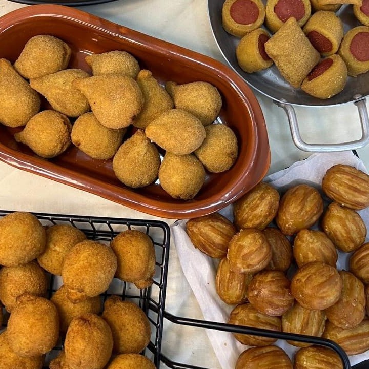 25 coxinha, 25 B. queijo, 25 risoles 25 B. carne