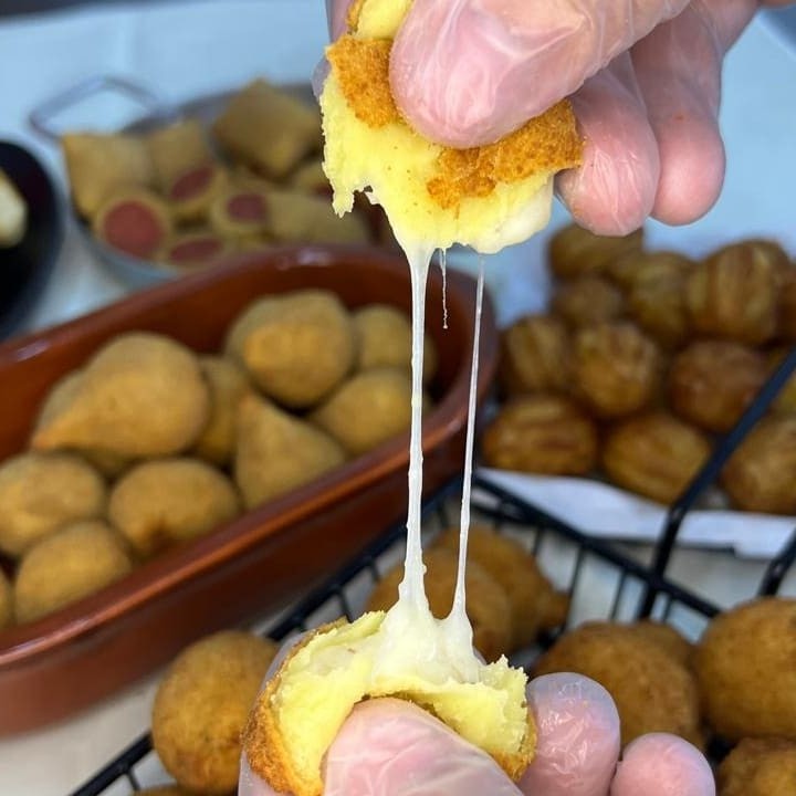 50 bolinhas de queijo (25g) com massa leve e casquinha crocante. Recheio super cremoso, feito com queijo de verdade! Uma explosão de sabor em cada mordida. Salgados de festa.