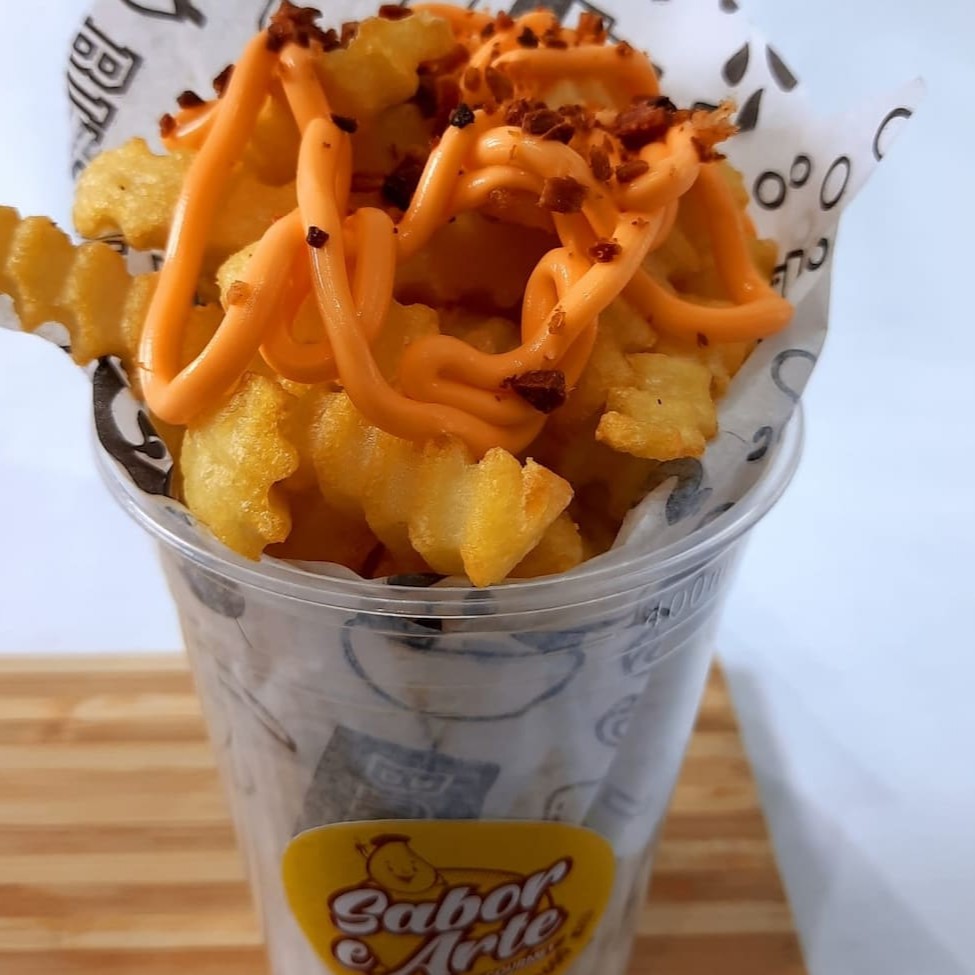 Porção 220 grs Batata crinkle onduladinha caprichada no molho cheddar finalizada com farofa crispy de bacon.