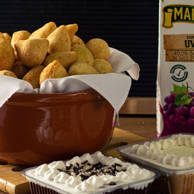 50 deliciosos salgados mistos, crocantes e sequinhos. 02 sobremesas 1 suco