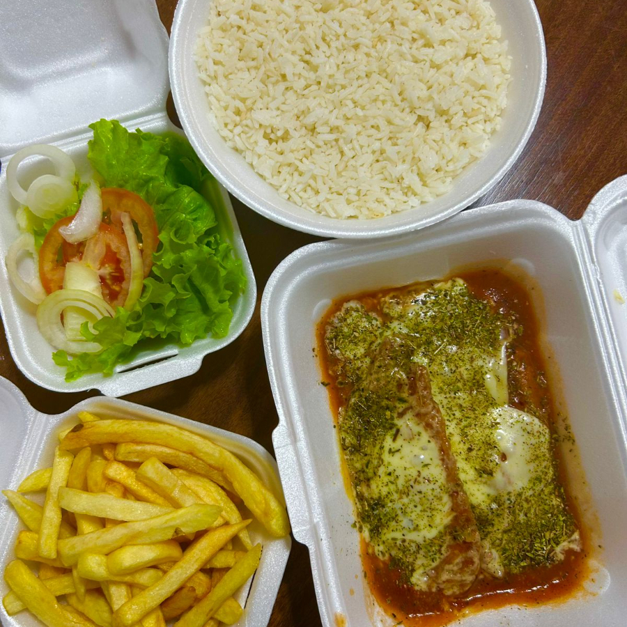 Marmitex de filé de frango a milanesa, acompanha arroz, feijao, batata frita, farofa, couve e Guaraná 200ml grátis.