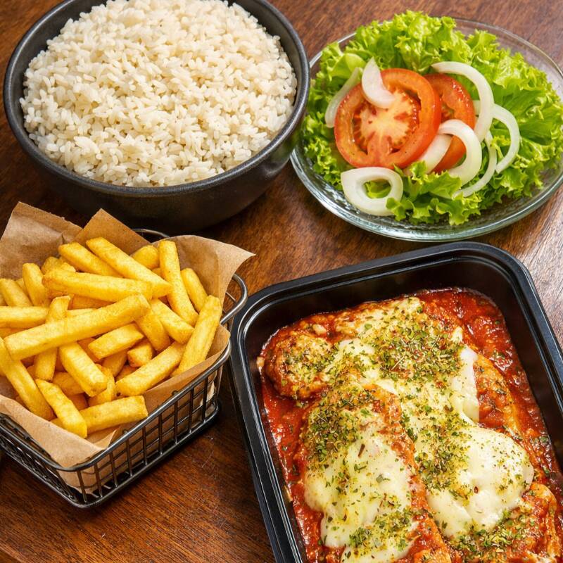 File de frango parmegiana acompanha arroz separado, batata frita e salada! Acompanha Guaraná antárctica 350ml. Todos os itens são enviados separados.