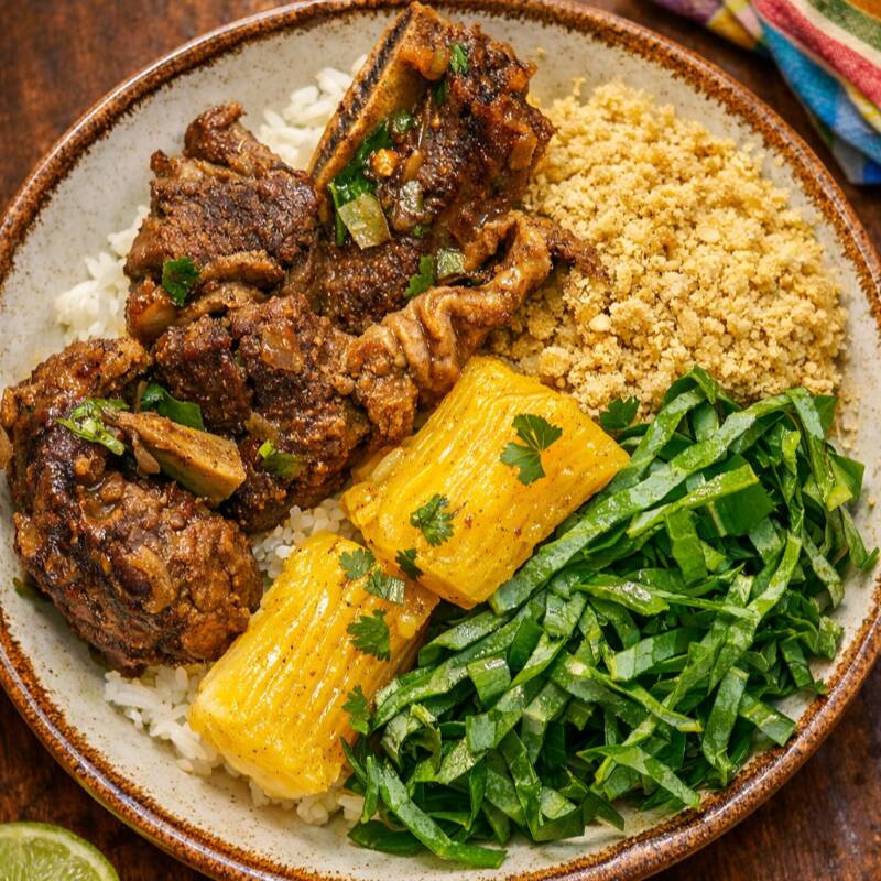 Marmita de costela com mandioca, acompanha arroz, feijao, farofa, couve e Coca-Cola 200ml gratis