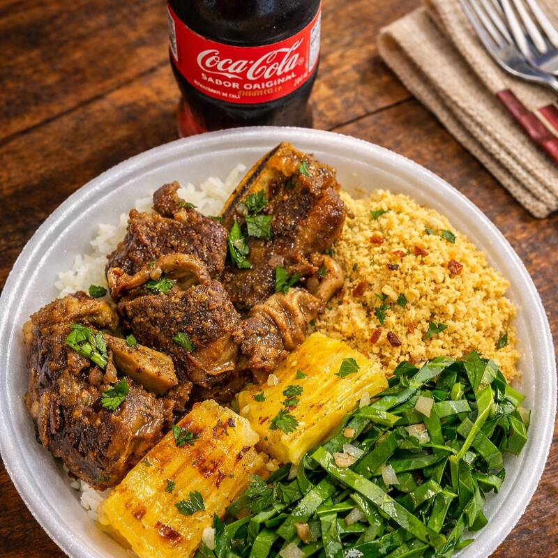Costelinha, arroz, feijão, farofa, couve, mandioca frita e salada com alface tomate e cebola. Prato tipico nordestino e cheio de sabor. Marmitex acompanha Coca-Cola.