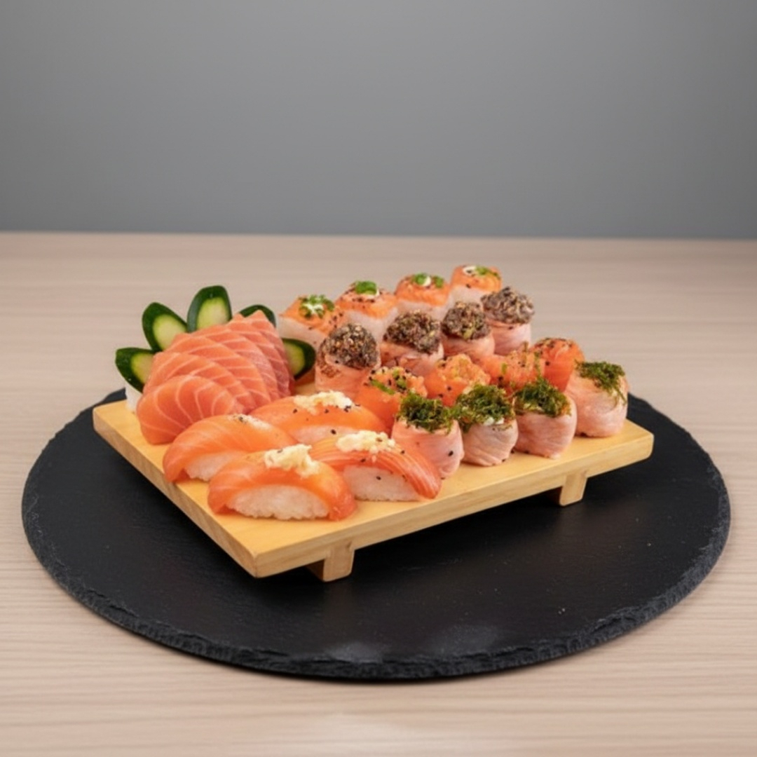 3 temaki a sua escolha .18 sashimis salmão .36 sushis variados .3 salmão grelhado .3 mini porção de shimeji .6 guiozas de carne bovina .3 rolinhos de queijo .3 rolinhos de legumes