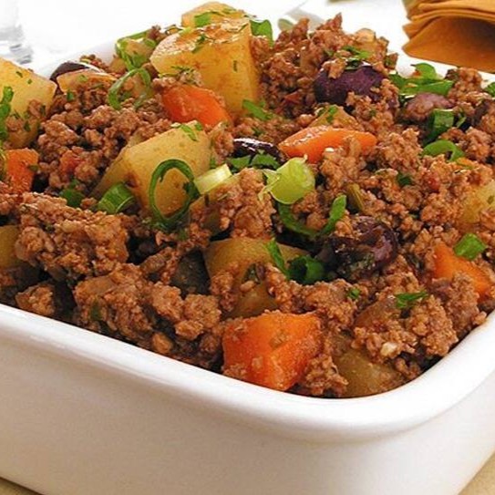 Carne moida refogada com batata e cenoura, arroz, feijão + 2 acompamentos