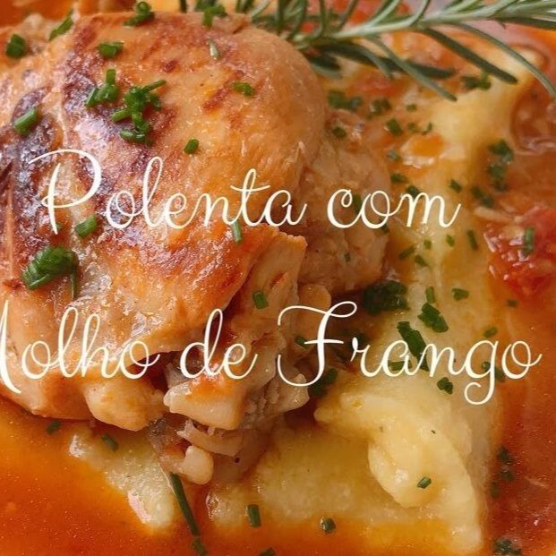 Deliciosa polenta cremosa, com frango ao molho, arroz branco, feijão e salada de alface e tomate