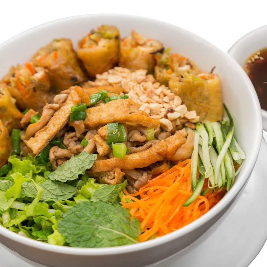Massa de Arroz, com rolinho primavera vegetariano (vegano) cortado, tofu, cogumelo, cebolinha e amendoim. Acompanha molho especial à base de soja. É um macarrão de arroz super saboroso, com o melhor tempero da culinária vietnamita.