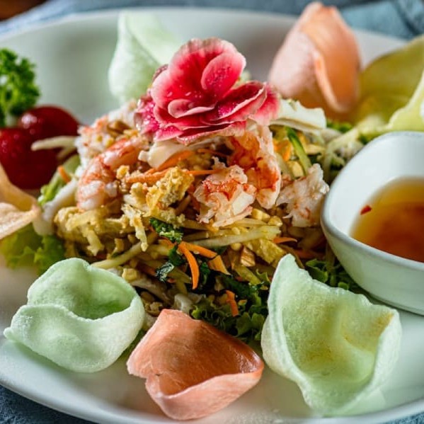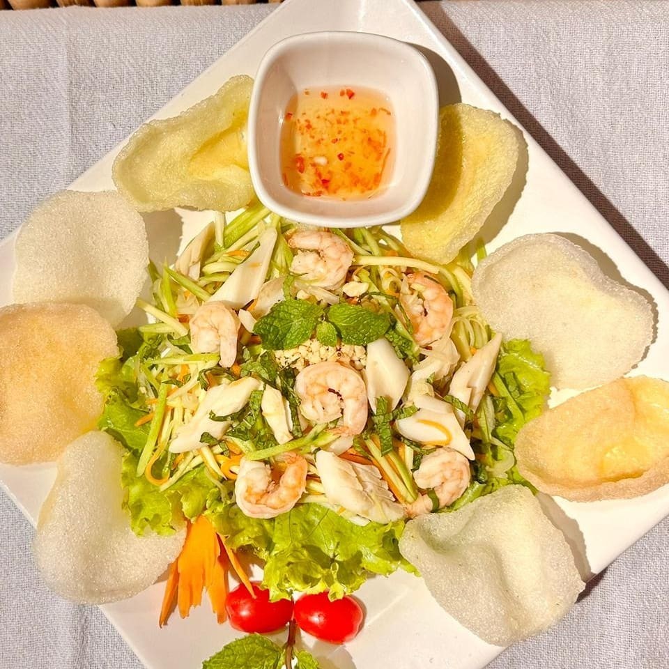 Salada de mamão verde,cenoura,pepino, hortelã com camarão e lula. Acompanha molho especial de peixe e mandiopan.