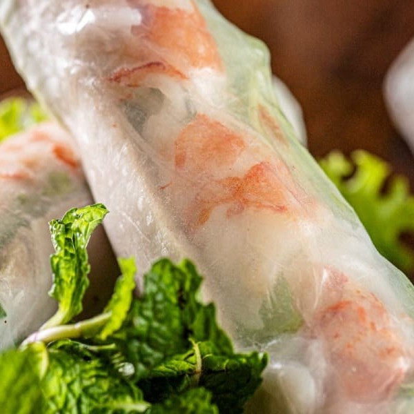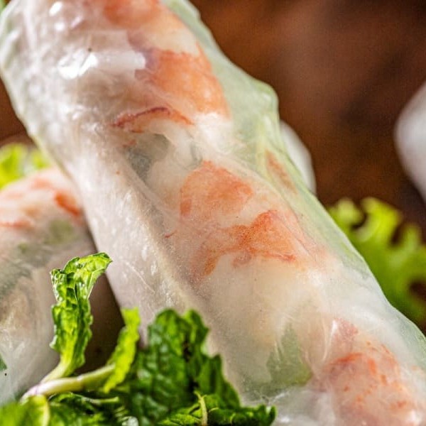 Rolinho Primavera Natural, com camarão, carne suína, alface,hortelã , pepino, moyashi e espaguete de arroz, enrolada na massa de arroz com molho de amendoim.