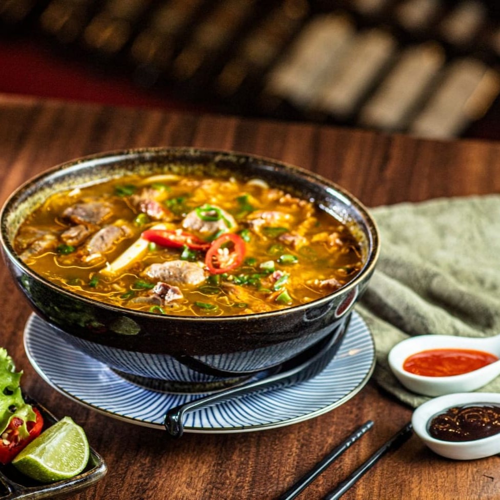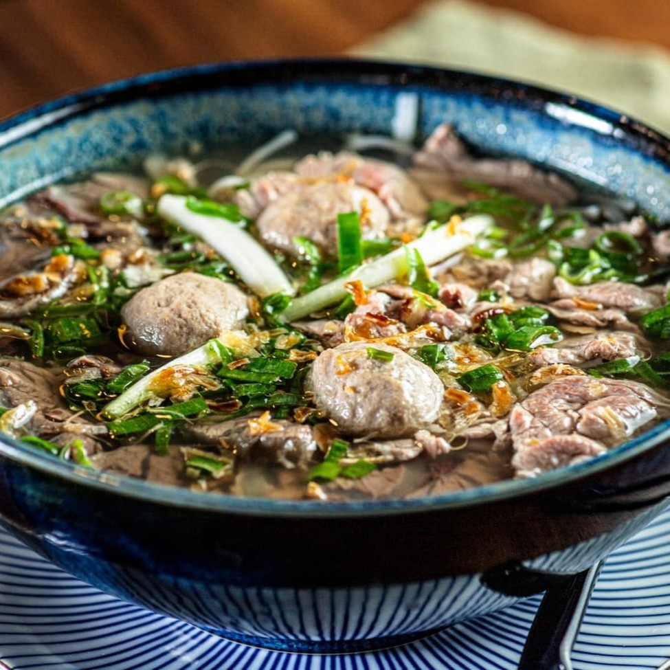 Macarrão de arroz com fatias de filé mignon,musculo,bolinho de carne e cebolinha.Caldo bovino picante com especiarias e capim santo. Acompanham mix de verduras, limão e broto de feijão.