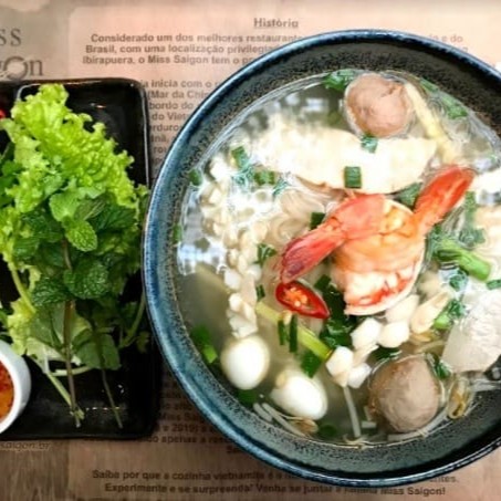 Talharim de arroz, com fatias de carne magra suína, ovo de codorna, camarão e lula. Acompanham mix de verduras, limão e broto de feijão. É um macarrão de arroz super saboroso. Não é comida japonesa, nem comida chinesa, nem comida tailandesa, mas sim comida vietnamita. Sabores do Vietnã: É fácil virar fã.