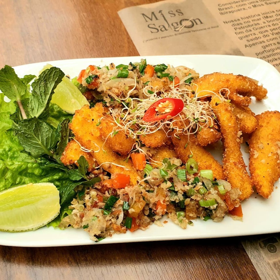 Iscas de peixe empanadas, à moda vietnamita. Acompanha molho especial da casa.
