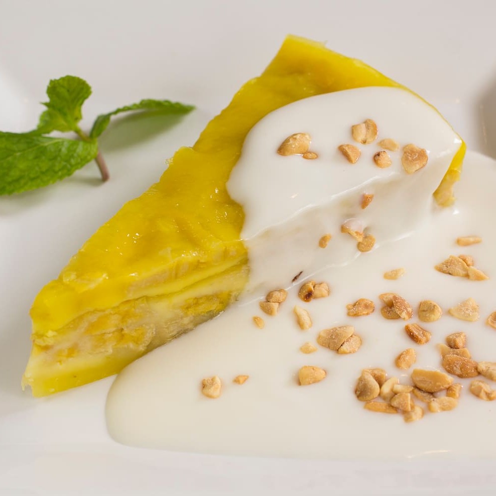 Torta de banana vietnamita, com creme de leite de coco, polvilhado com amendoim.