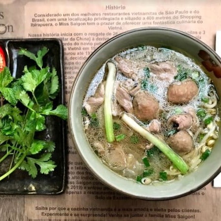 Talharim de Arroz, com fatias de carne baby beef e cebolinha. Acompanham mix de verduras, limão e broto de feijão. É um prato antioxidante, temperado com mais de 10 especiarias. É o prato mais famoso e tradicional do Vietnã, um prato ícone da cultura vietnamita. É um macarrão de arroz super saboroso em caldo bovino, com o melhor tempero da culinária vietnamita. Sabores do Vietnã: É fácil virar fã.