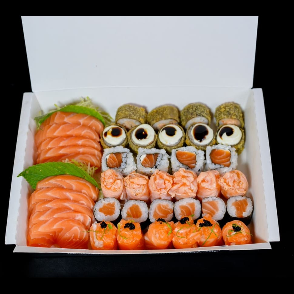 16 sashimis salmão, 8 niguiris salmão, 4 uramakis salmão, 4 salmonmakis e 4 jhous salmão. (Não é possível alterar os itens do combo.)
