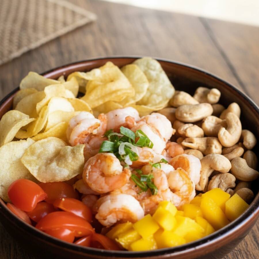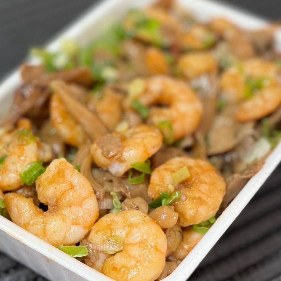 Camarão 100g, molho tariyake , tomate cereja ,manga, amendoim, batata doce frita e cebolinha