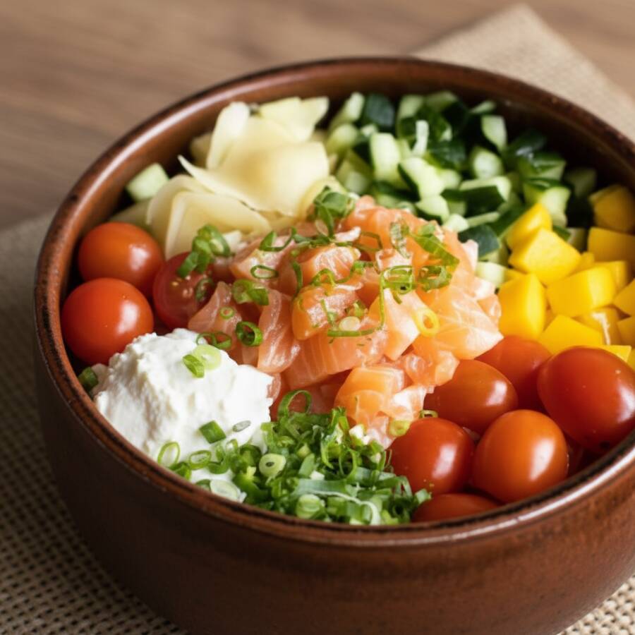 Atum crum em cubos 100g, sunomono, couve, edamame , manga e molho do chefe, tomate cereja