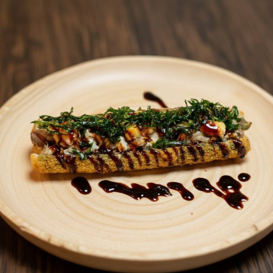 Hot empanado,cortado ao meio,recheado com salmão Grelhado ,finalizado com couve crispy