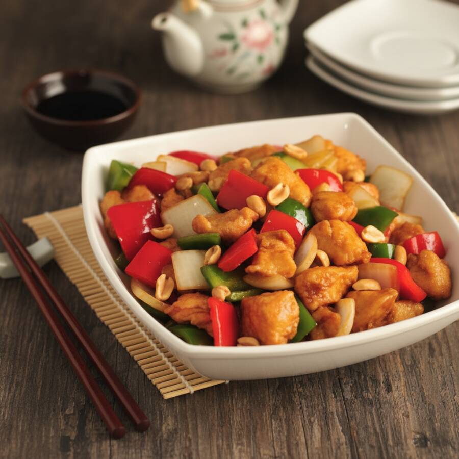 Peito de frango cortados em cubos com cebola, amendoim e pimentão verde e nosso molho exclusivo á base de shoyu. Acompanha gohan.