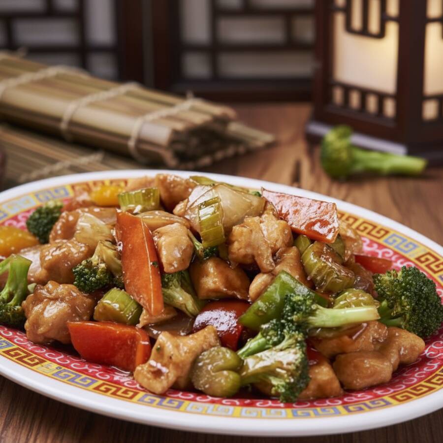 Fatias de frango, champignons, acelga, brócolis, cebola, cenoura, pimentão verde, repolho e nosso molho exclusivo a base de shoyu. acompanha gohan.