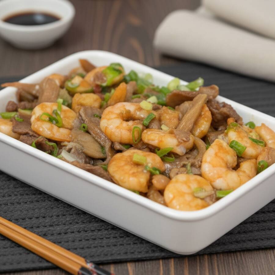 Fatias de carne, champignons, acelga, brócolis, cebola, cenoura, pimentão verde,repolho e nosso molho exclusivo a base de shoyu. acompanha gohan.