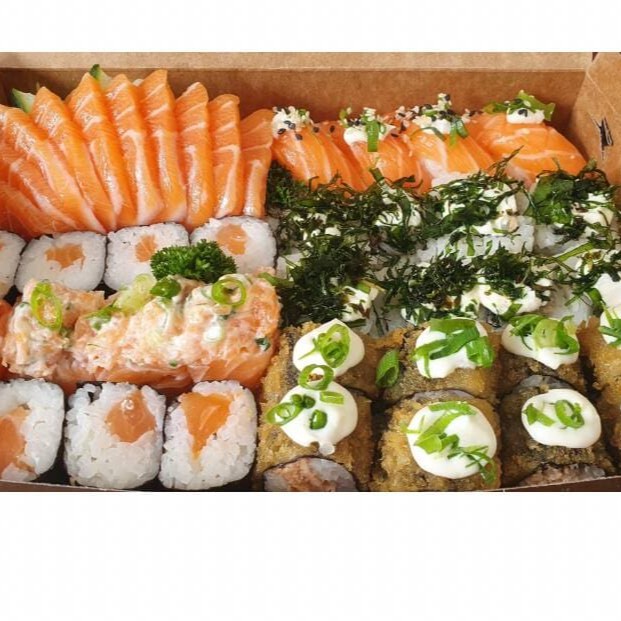 16 sashimis salmão, 8 niguiris salmão, 4 uramakis salmão, 4 salmonmakis e 4 jhous salmão. (Não é possível alterar os itens do combo.)