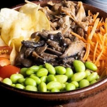 Shimeji, azeite, cenoura ralada ,tomate cereja ,edamame ,batata doce frita ralada