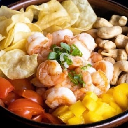Camarão 100g, molho tariyake , tomate cereja ,manga, amendoim, batata doce frita e cebolinha