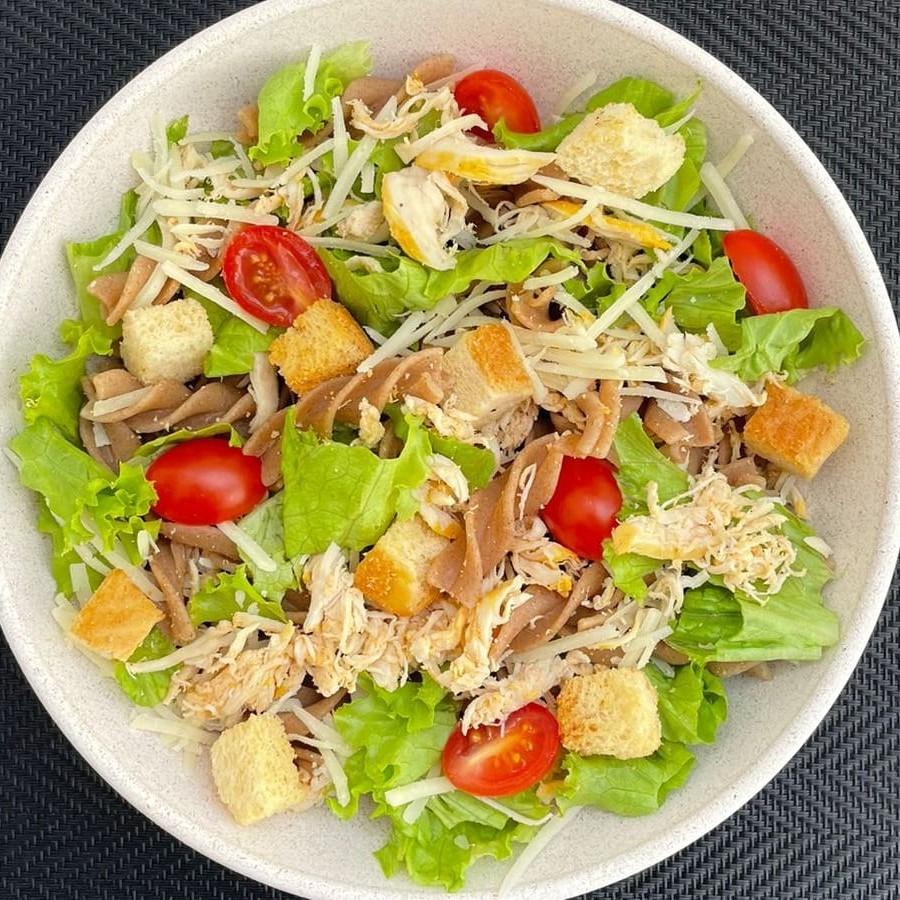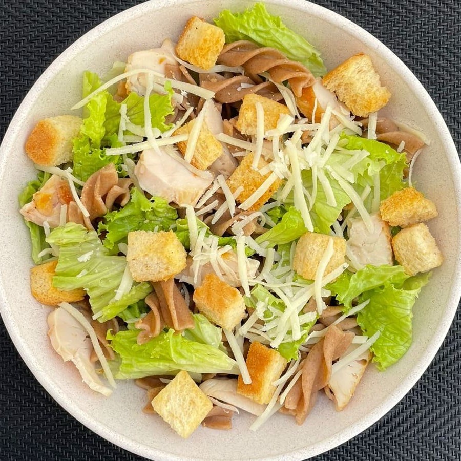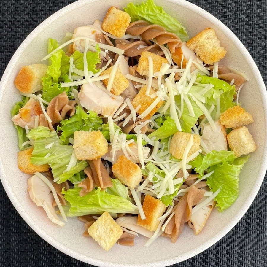 Ingredientes: Macarrão integral (150g), frango grelhado em tiras (100g), alface (30g), croutons (20g), lascas de parmesão (20g).