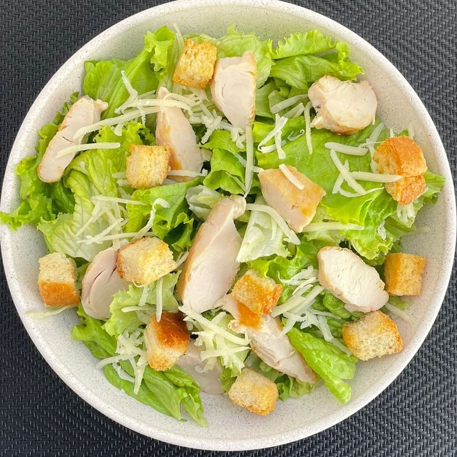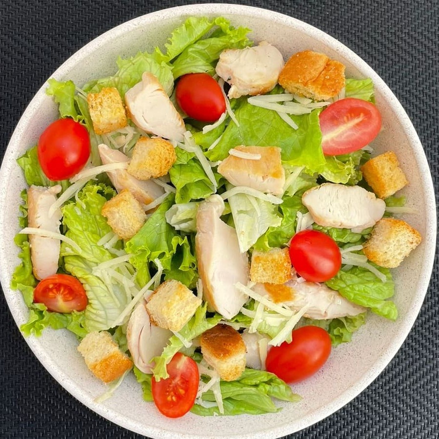 Ingredientes: frango grelhado em tiras (100g), alface, (60g) croutons (20g), tomate (60g) e lascas de parmesão (20g).