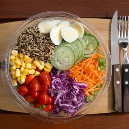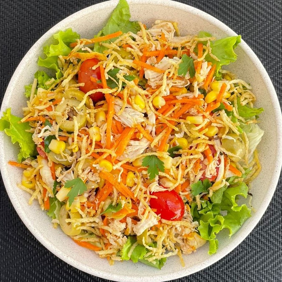 Ingredientes: frango desfiado temperado com azeite e orégano (60g), alface (60g), cenoura (20g), azeitona (40g), milho (40g), salsa, tomate (40g), batata palha (20g).