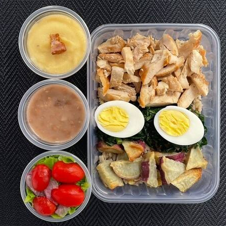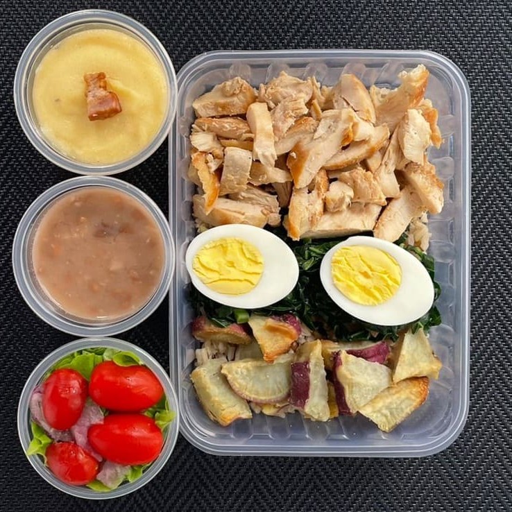 Ingredientes: Arroz integral (100g), frango grelhado em tiras(100g), batata doce assada (60g), couve refogada (20g), 1 ovo cozido, farofa temperada, salada (50g).