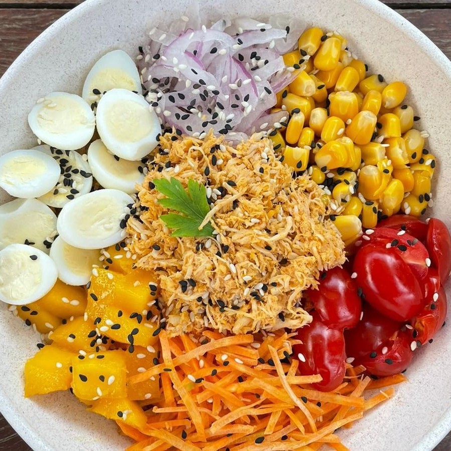 Ingredientes: Arroz integral (100g), manga (30g), milho (40g), tomate (40g), cebola (15g), cenoura (20g), ovo de codorna (4 ovos), frango desfiado (50g) e gergelim.
