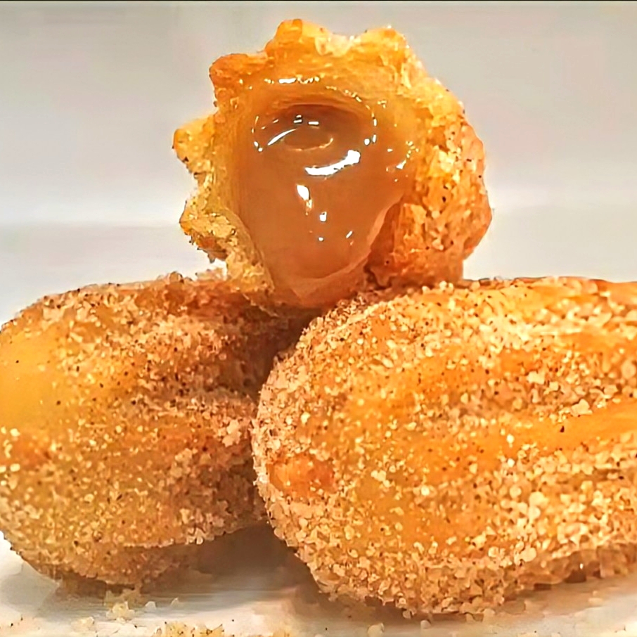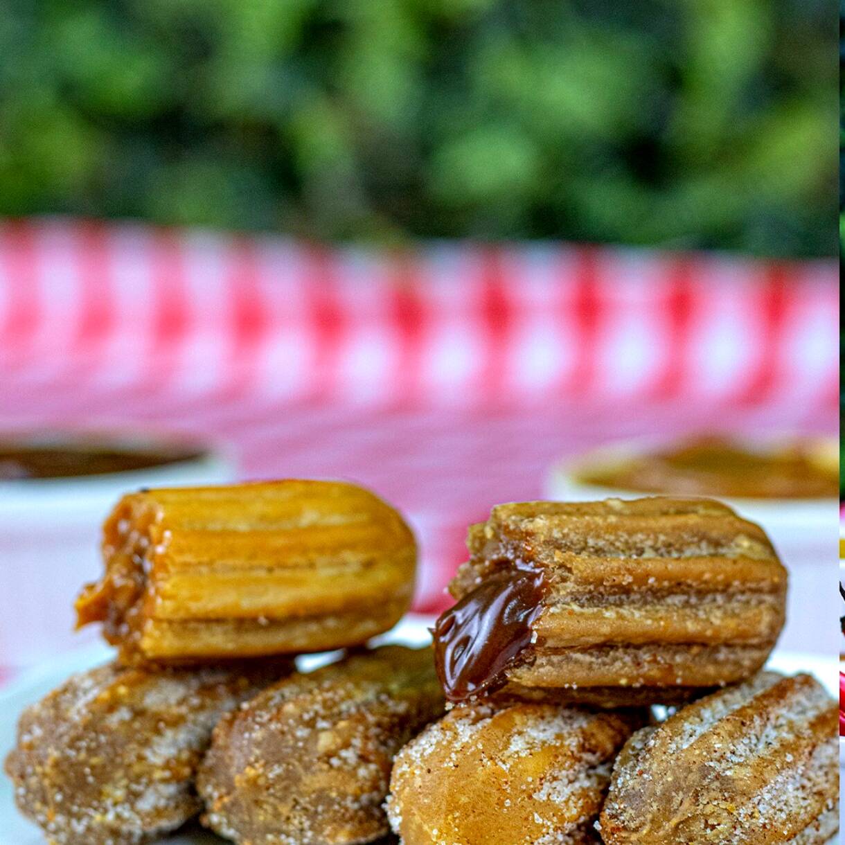 Churros sequinho com um doce de leite de verdade tamanho festa maior que mini., com açúcar e canela.