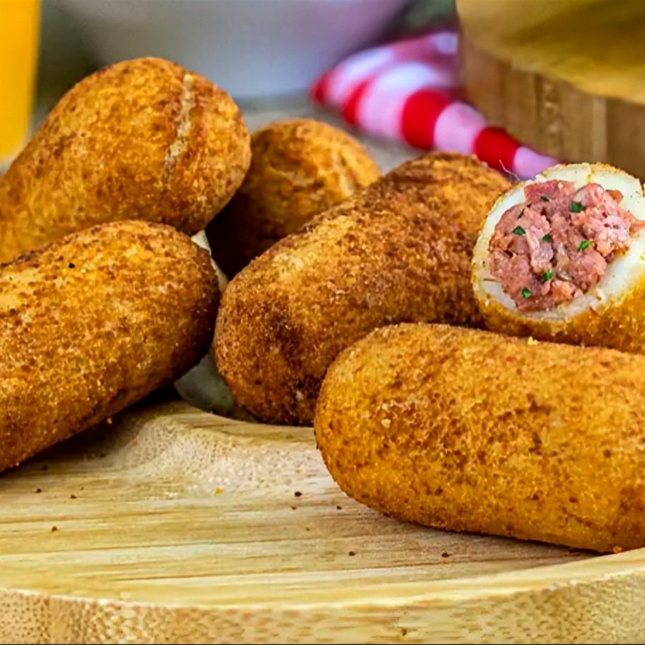 50 Bolinhas de Carne Festa de 20 a 25 grs com massa de batata macia por dentro e crocante por fora, impossível comer um só.