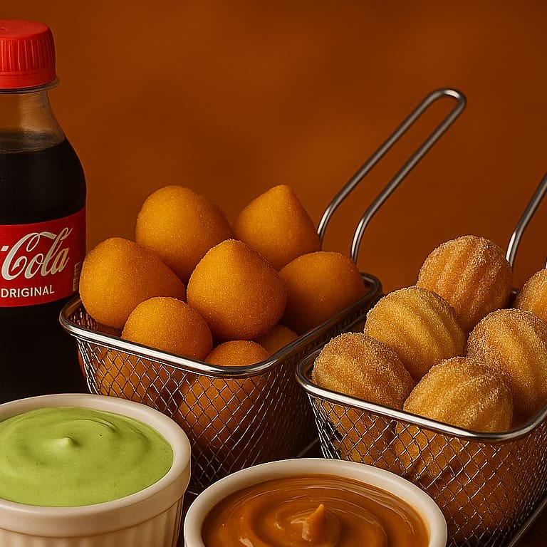 Nossos salgados são preparados com ingredientes frescos e selecionados, garantindo uma textura crocante por fora e um recheio suculento por dentro. São 15 unidades de mini salgados 15g coxinha e bolinho de queijo + refrigerante Coca-Cola 200 ml +10 Mini Churros.