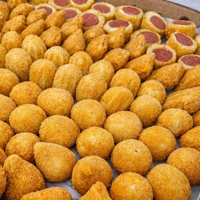 Perfeito para a sua festa! Delicioso combo com 100 salgados sortidos: Coxinhas, Kibes, Bolinhas de queijo, Travesseiros de presunto e queijo e enroladinho de salsicha