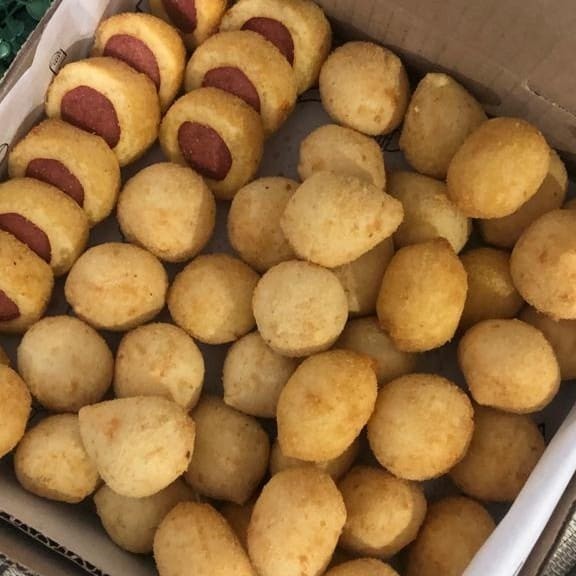 Coxinha, bolinho de queijo, bolinho de calabresa, risoles de presunto e queijo, enroladinho de salsicha