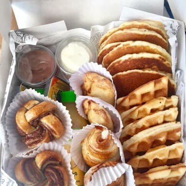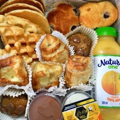 Na caixa de presente : 4 mini panquecas americanas 4 mini waffles 2 Tostex 2 cupcakes 2 mini Brownie 1 Manteiga 1 doce de leite 1 cream cheese 1 geleia morango 1 geleia goiabada 1 suco de laranja 300 ml presente, mimo, cesta de café da manhã. Presente aniversário, casamento, noivado. Cesta café da manhã Presente Dia dos Pais