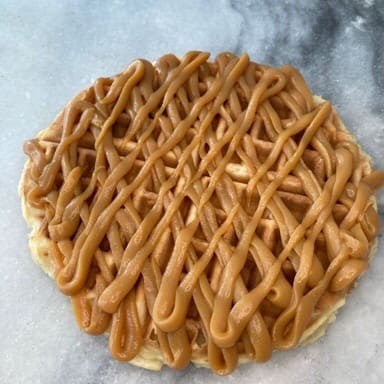 Waffle coberto com generosa camada de doce de leite de boa qualidade . Finalizado com Canela doce sobremesa chocolate café da manha cafe da tarde